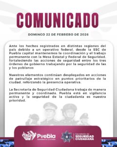*San Pedro Cholula, Pue., 22 de febrero de 2026.–* El Gobierno Municipal informa que se han reforzado los dispositivos de seguridad en todo el territorio, con el objetivo de preservar el orden público y garantizar la tranquilidad de las familias cholultecas y visitantes.