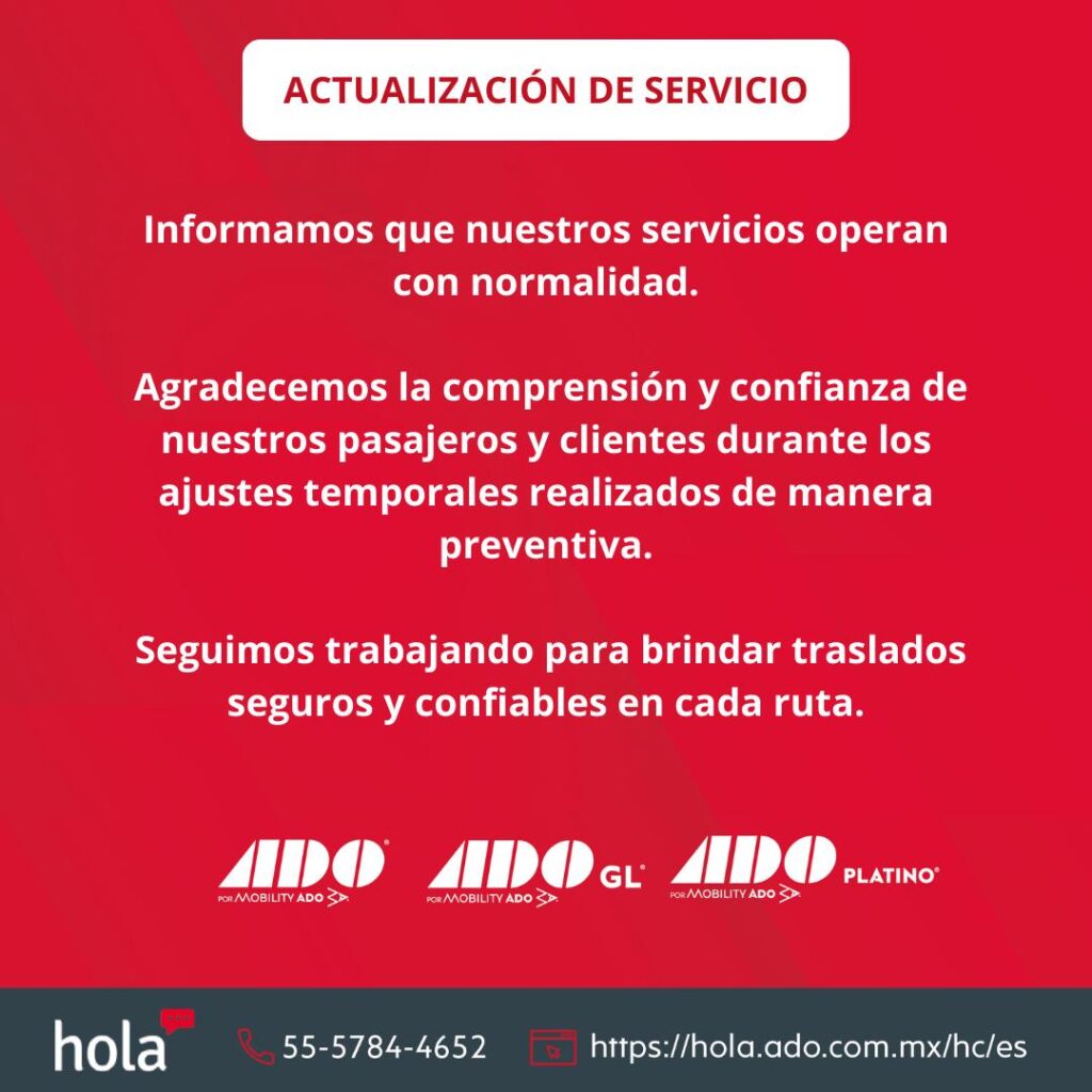 A través de comunicados difundidos por sus distintas marcas —ADO GL, ADO Platino, Estrella de Oro, Estrella de Oro Plus, Estrella de Oro Diamante, AU y OCC— la empresa agradeció la comprensión y confianza de pasajeros y clientes durante el periodo en que se aplicaron dichas medidas.