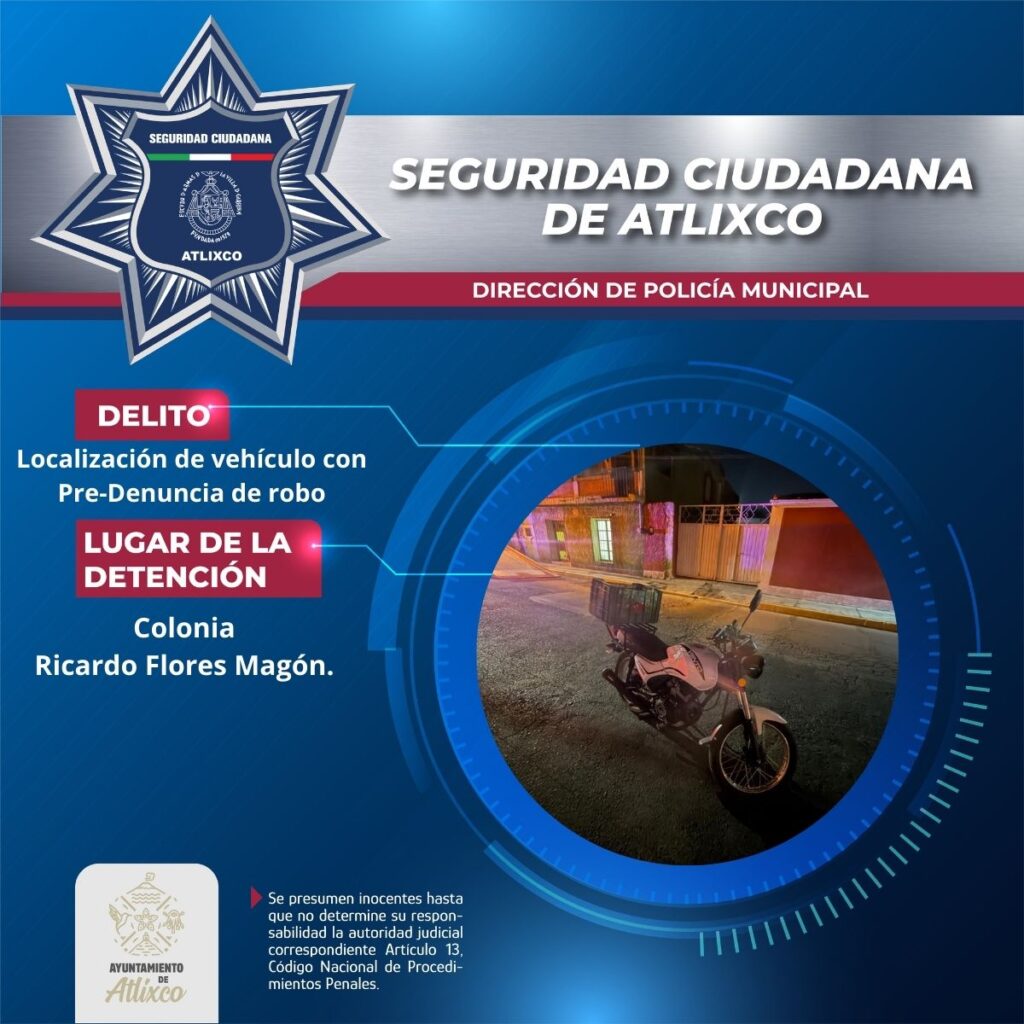 Durante operativo preventivo, elementos de la Secretaría de Seguridad Ciudadana de Atlixco, detectaron una motocicleta marca Vento, color blanco, que obstruía el flujo vehicular. Al no encontrarse el conductor o propietario en el lugar, se realizó la verificación correspondiente en las plataformas oficiales, confirmando que la unidad contaba con predenuncia de robo.