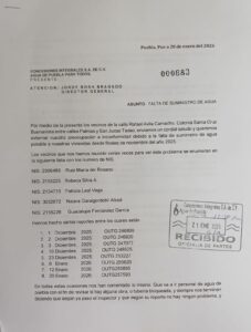 “Sin embargo, a partir de la segunda semana de 2025, empezó a fallar: Nos quedamos sin agua por ahí del 8 de diciembre. Notamos, además, que cada vez eran más las pipas de agua en casas de los vecinos de la colonia. Se reportó a Agua de Puebla, nos dieron el reporte OUTG247780, con orden de trabajo 1909459, comentaron que no había razón para la falta de agua, ya que no habían reportado algún trabajo o mantenimiento en la zona en esas fechas.