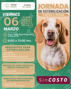 La jornada se realizará este viernes 6 de marzo, de 9:00 a 13:00 horas, en el Fraccionamiento Valle Real Polígono II, en el área verde, donde se brindarán servicios gratuitos de esterilización, consulta médica preventiva y desparasitación.