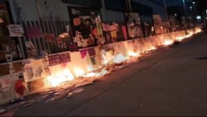 Afuera e la FGE, se aprecia una línea de fuego, donde las mantas arden, mientras al interior elementos de seguridad resguardan el inmueble.