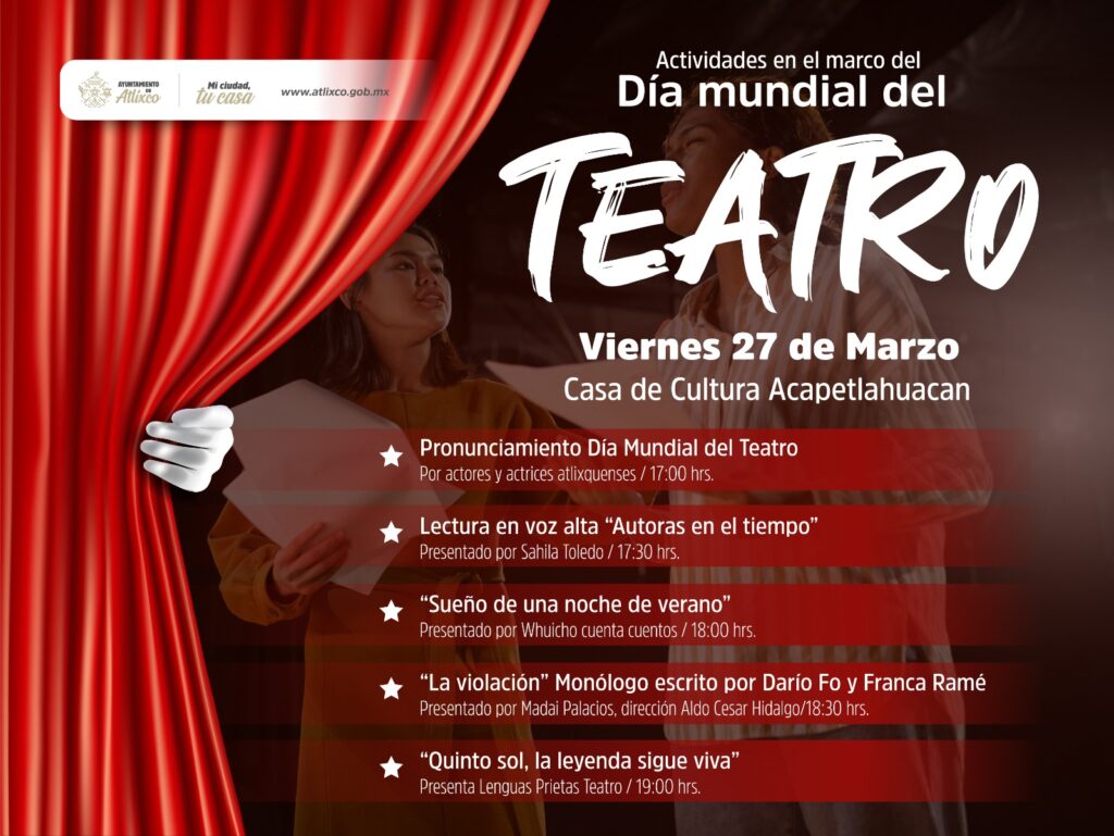 En el marco del Día Mundial del Teatro, Ariadna Ayala, se impulsa este viernes 27 de marzo una cartelera cultural gratuita y abierta al público en la Casa de Cultura Acapetlahuacan, Atlixco.