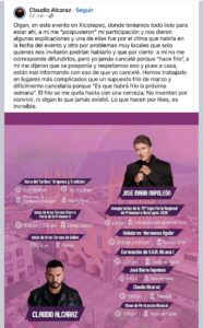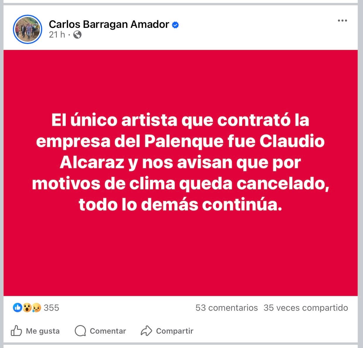 El 28 de marzo, el cómico involuntario edil de Xicotepec, Carlos Barragán, publicó en sus redes sociales (a las que es adicto, aunque muchas veces se le revierten) que el cantante Claudio Alcaraz era el único artista contratado por la empresa que maneja el palenque de la feria y que –según él- había cancelado su participación ante el mal clima.