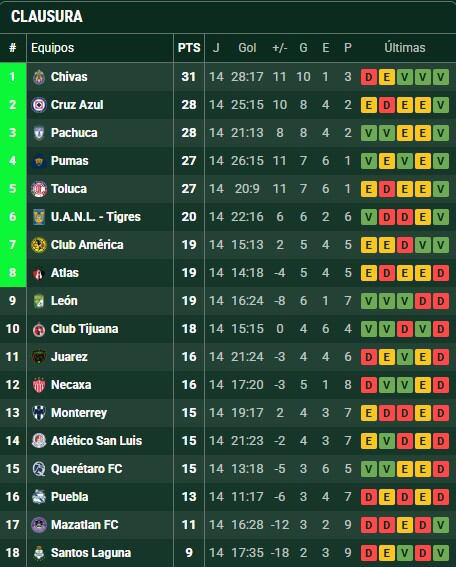 Las Chivas están en la primera posición con 31 puntos, seguidos por el Cruz Azul de 28 unidades, mismas que el Pachuca.