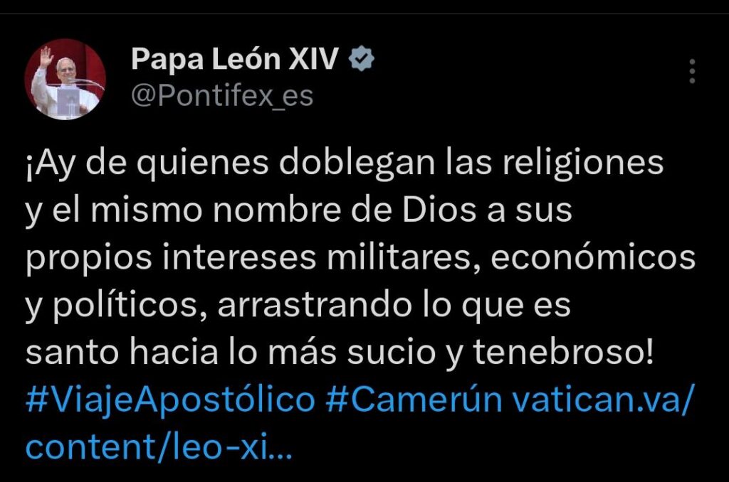 En una nueva alusión velada a Trump y Netanyahu, a través de sus redes sociales, el Papa León XIV reflexionó sobre aquellos que doblegan las religiones o las usan con fines perversos.