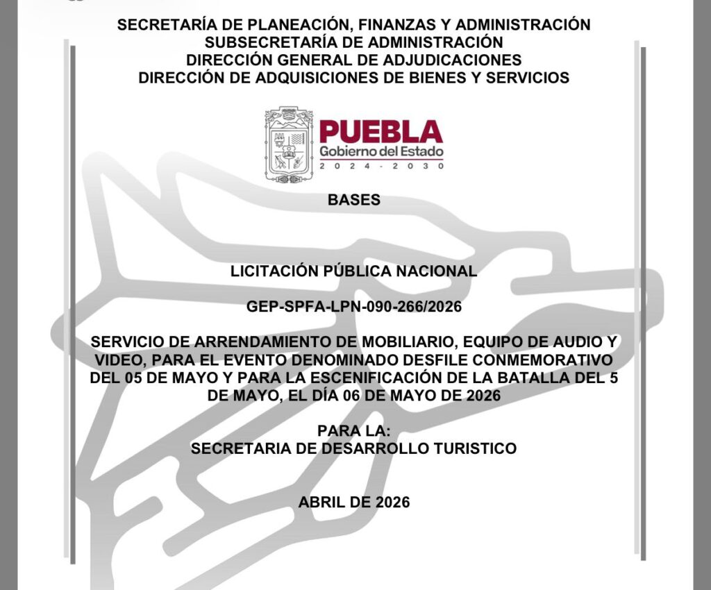 El gobierno de Puebla lanzó una licitación pública nacional, para el arrendamiento de equipo de audio y video, así como el mobiliario del desfile del 5 de Mayo, con la escenificación de la Batalla de Puebla.