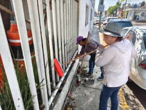 Durante la jornada se llevaron a cabo labores de mantenimiento y mejora del espacio, entre ellas la pinta de la reja de acceso principal, barrido general, retiro de maleza en banquetas, pintura de guarniciones y limpieza del área verde en la zona de entrada.
