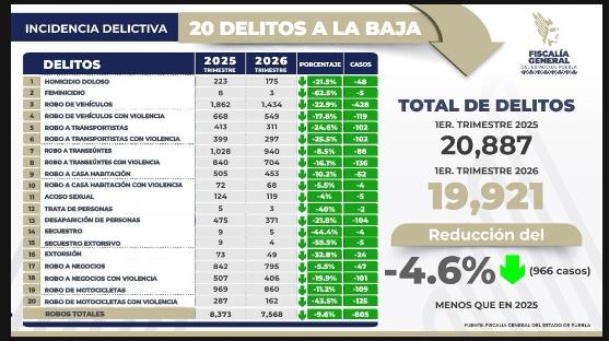De acuerdo con estadísticas de la Fiscalía General del Estado (FGE) y del Secretariado Ejecutivo del Sistema Nacional de Seguridad Pública (SESNSP), durante el primer trimestre de 2026, en comparación con el mismo periodo del año pasado, los índices delictivos totales tuvieron una disminución del 4.6 % y 20 delitos de impacto social tuvieron una reducción importante, tratándose de delitos como feminicidio, homicidio doloso, robos de vehículos, a transportistas, a casa habitación, a negocios, a transeúntes, entre otros.