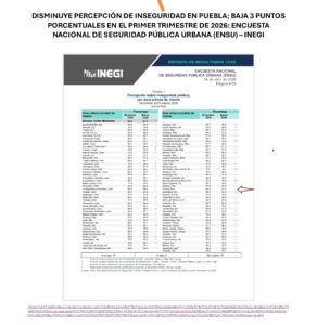 El estudio muestra que, mientras la media nacional de percepción de inseguridad registró una disminución de 2.3% durante el primer trimestre de 2026, en Puebla la reducción fue de 3%.