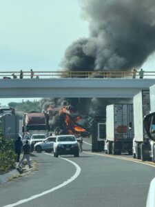 Refieren que el conductor de la unidad pesada siniestrada habría chocado por alcance contra un camión que transportaba madera, lo que provocó que volcara y se incendiara.